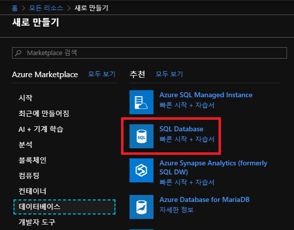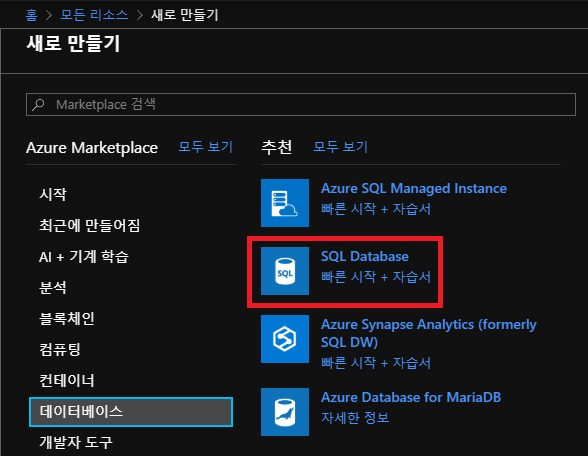 Azure MarketPlace에서 데이터베이스를 클릭하고 SQL Database를 클릭합니다.