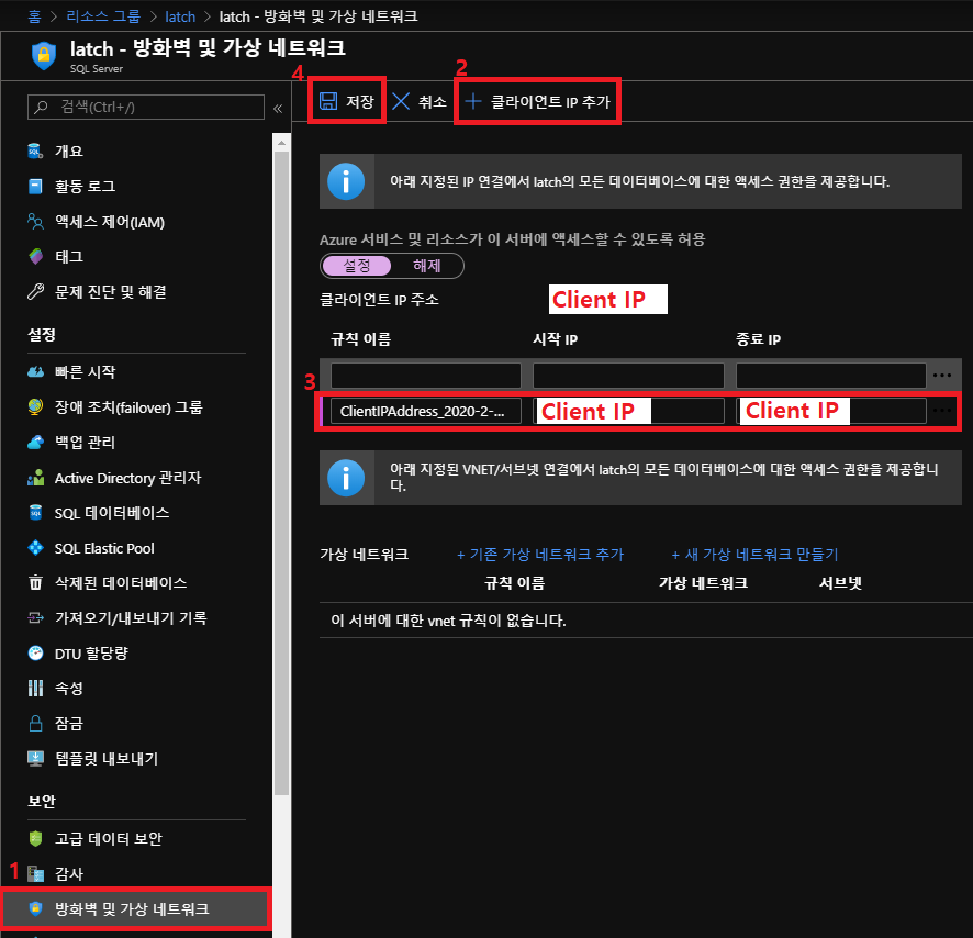 방화벽 및 가상 네트워크를 클릭하고 클라이언트 IP 추가를 클릭하여 SQL Server로 접근할 Client IP를 추가를 하고 저장을 클릭합니다.