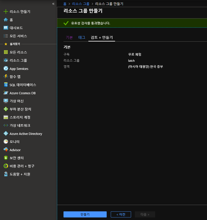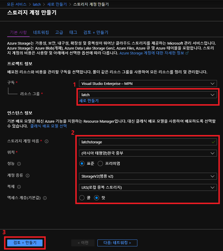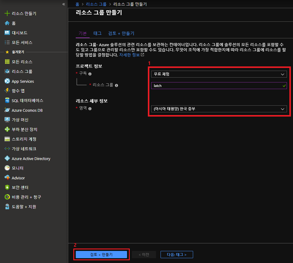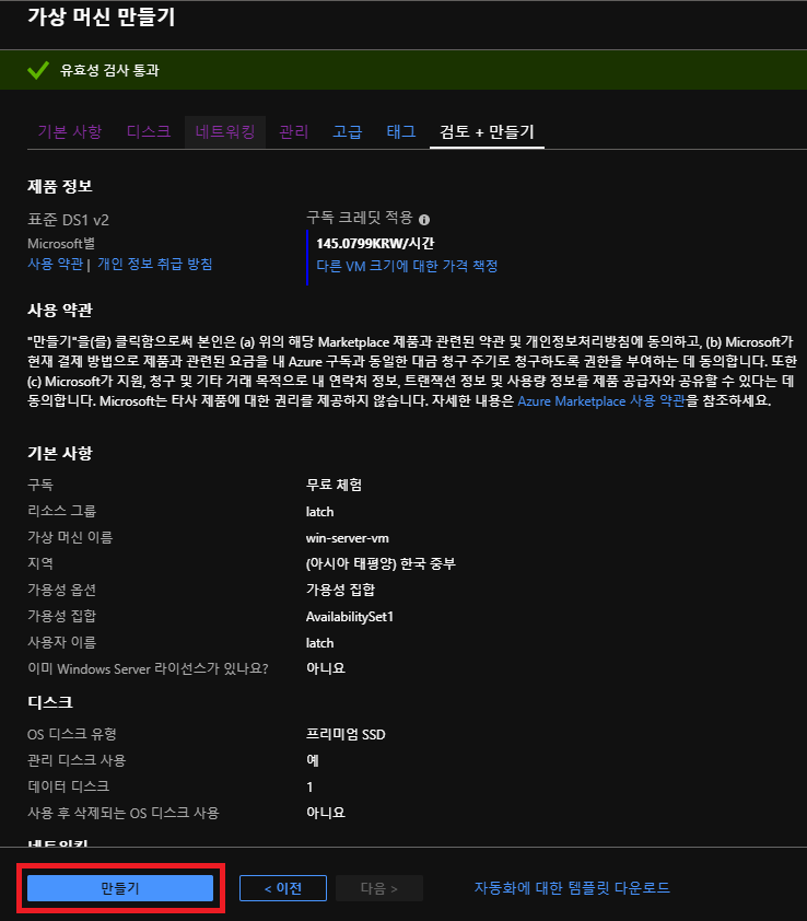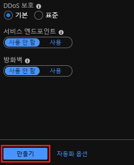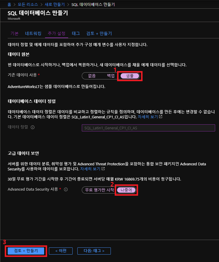 고급 데이터 보안(30일 무료 후 유료)은 나중에로 선택하고 검토 + 만들기 버튼을 클릭합니다.