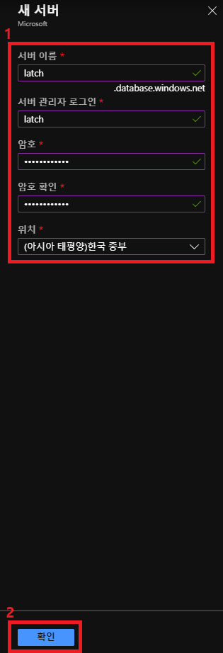 서버 이름, 서버 관리자 이름, 암호, 위치를 지정하고 확인 버튼을 클릭합니다.