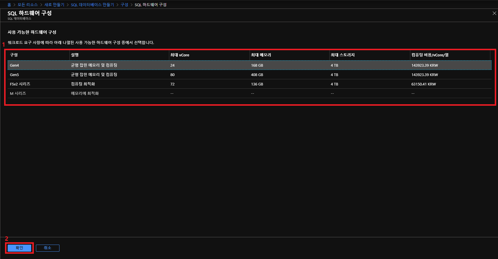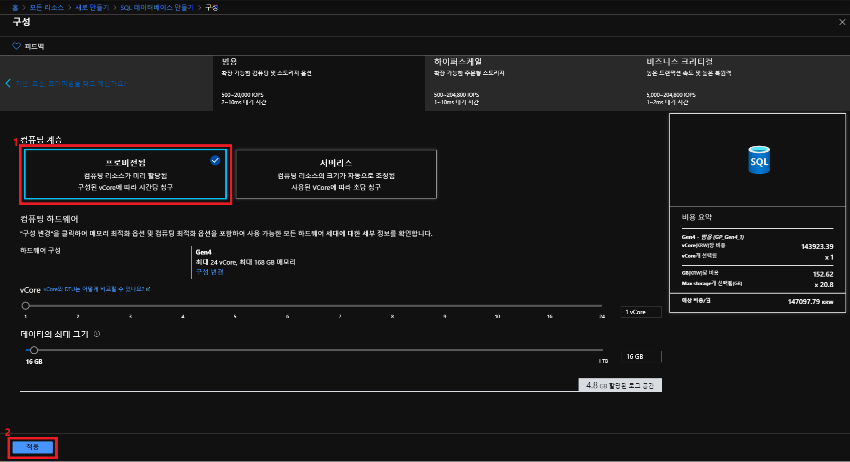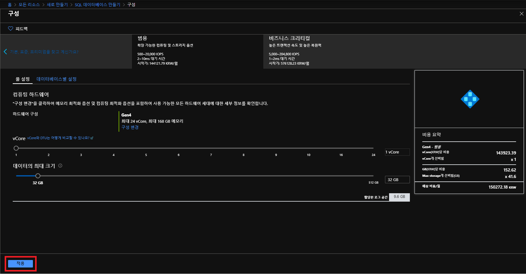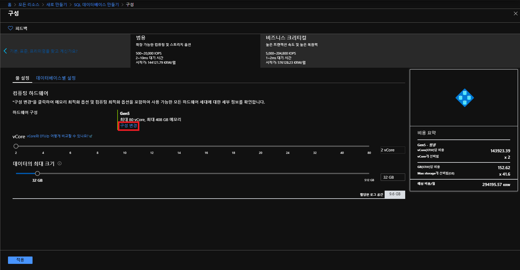 구성 변경을 클릭하여 하드웨어의 구성(DTU 또는 vCore 중 선택)을 변경합니다.