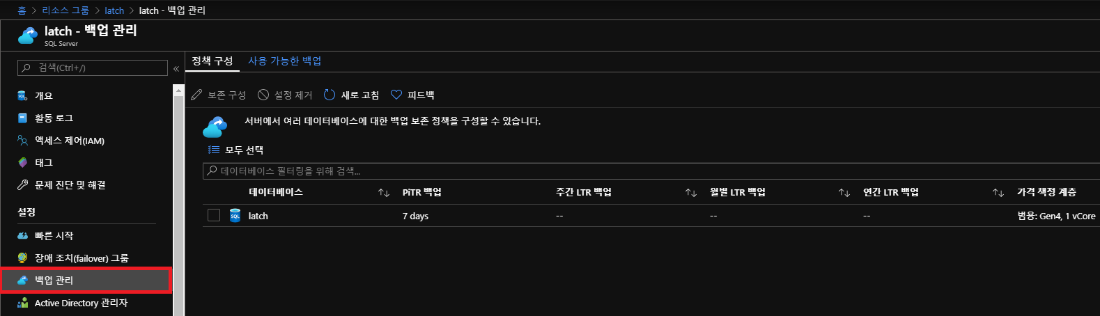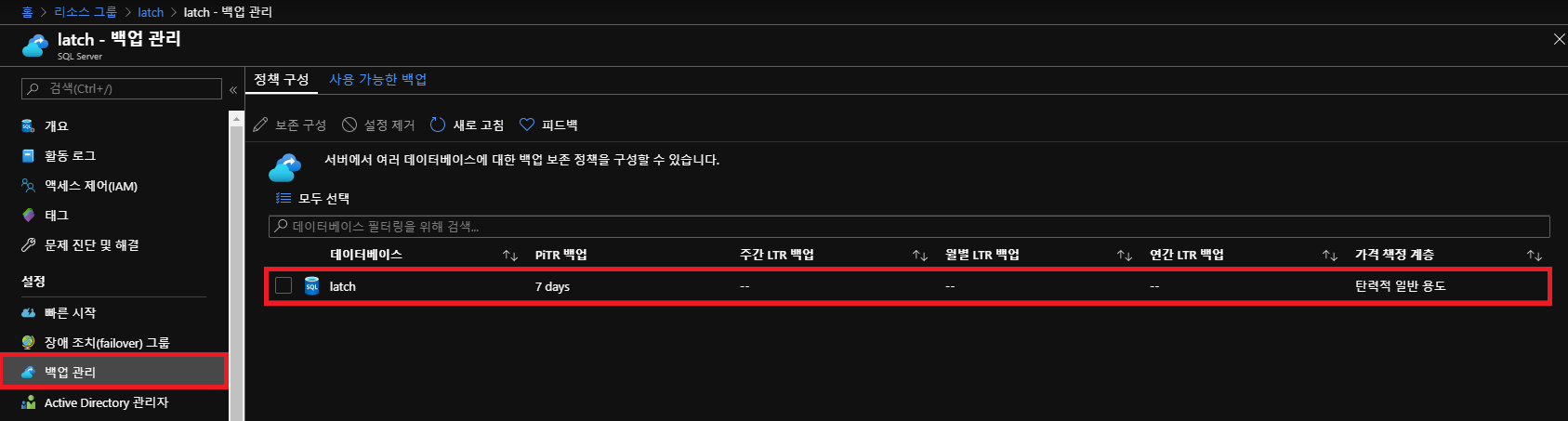 백업 관리에서는 시점 복원 설정이 가능합니다. 단일 데이터베이스에서는 5~10분 단위로 트랜 잭션 로그가 쌓여 복구가 가능합니다.
