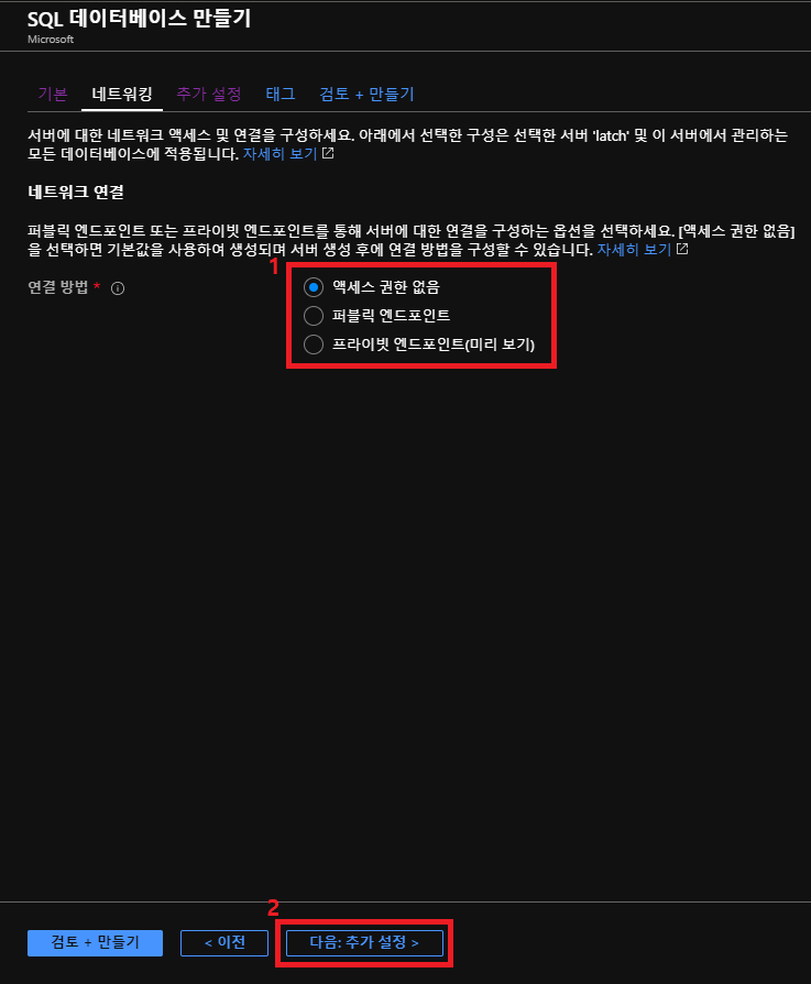 연결 방법을 변경할 경우 퍼블릭 엔드포인트를 선택합니다. 프라이빗 엔드포인트는 아직 프리뷰입니다.