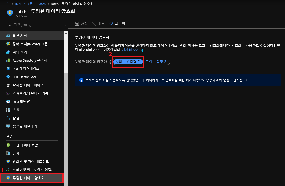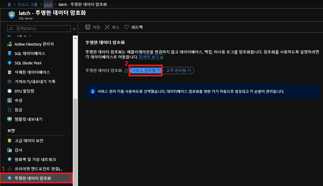투명한 데이터 암호화를 클릭하고 투명한 데이터 암호화 키 관리를 선택합니다.