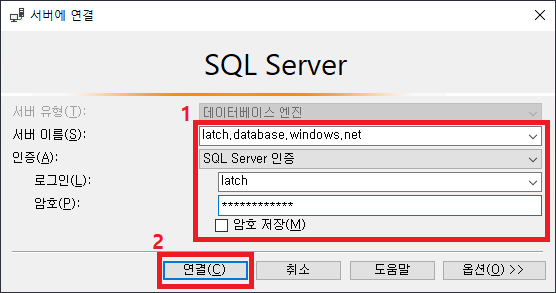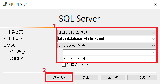SSMS에서 서버 이름, 계정, 패스워드를 입력하고 연결 버튼을 클릭합니다.
