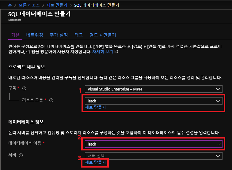 리소스 그룹을 선택하시고 데이터베이스 이름을 지정하고 서버의 새로 만들기를 클릭합니다.