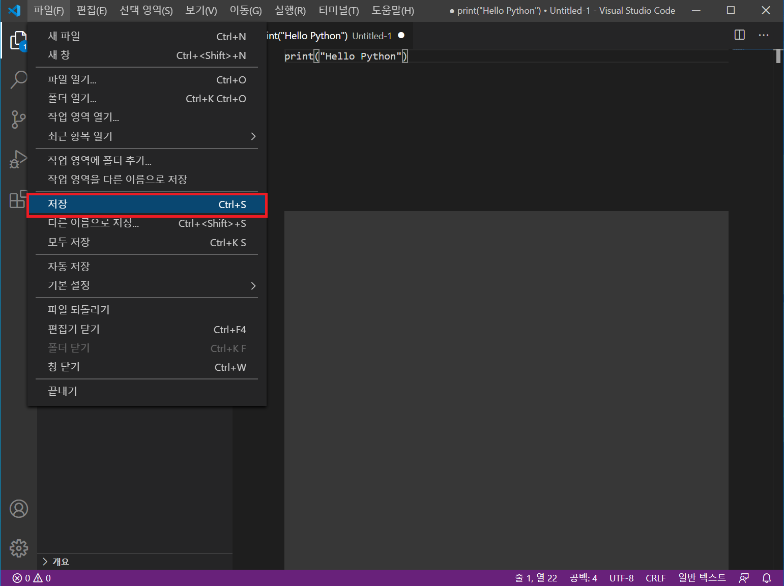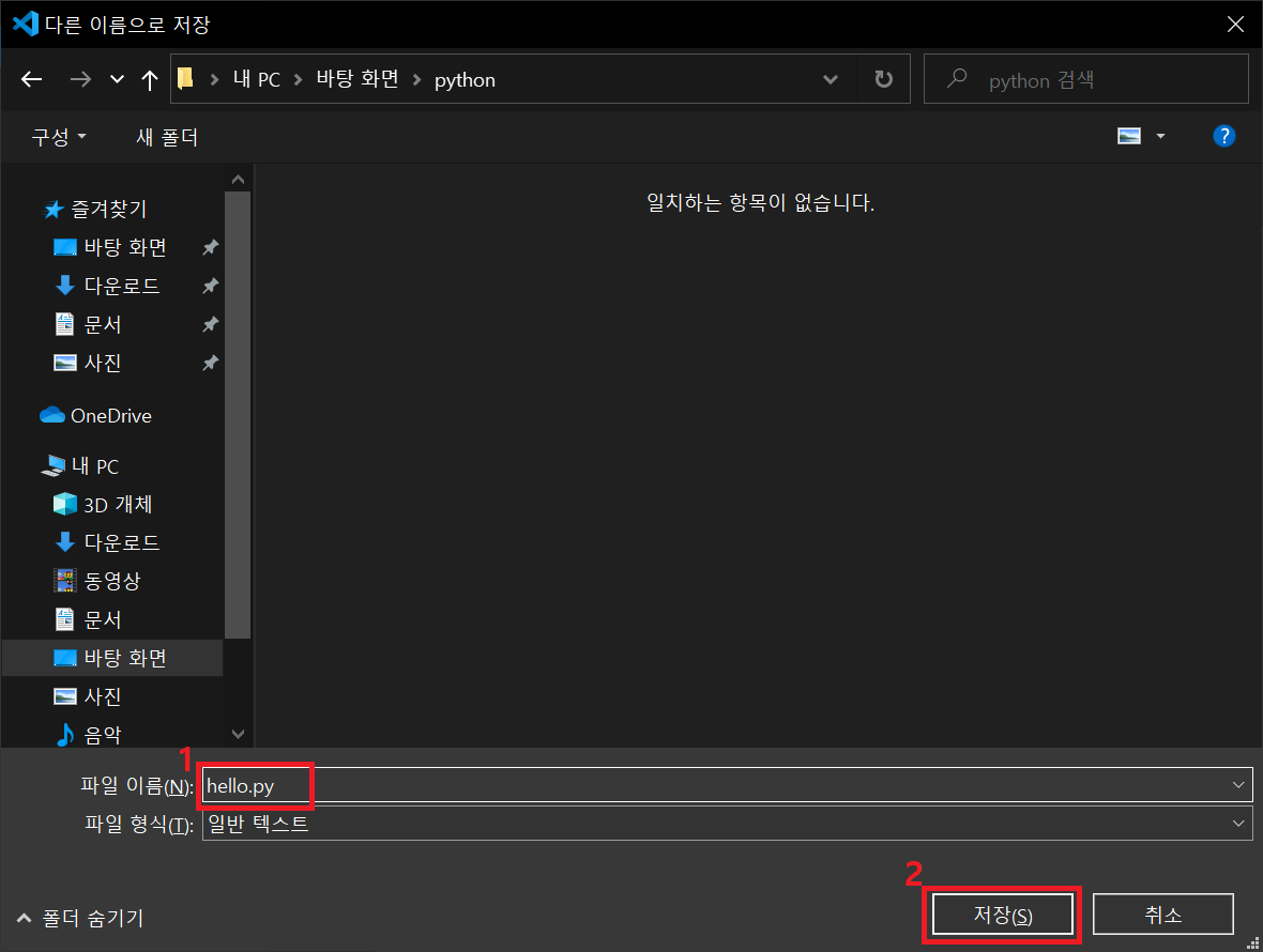 파일 이름(hello.py)을 지정하고 저장 버튼을 클릭합니다. 파이썬 프로그램은 파일 이름 뒤에 .py라는 확장자를 붙여 저장합니다.