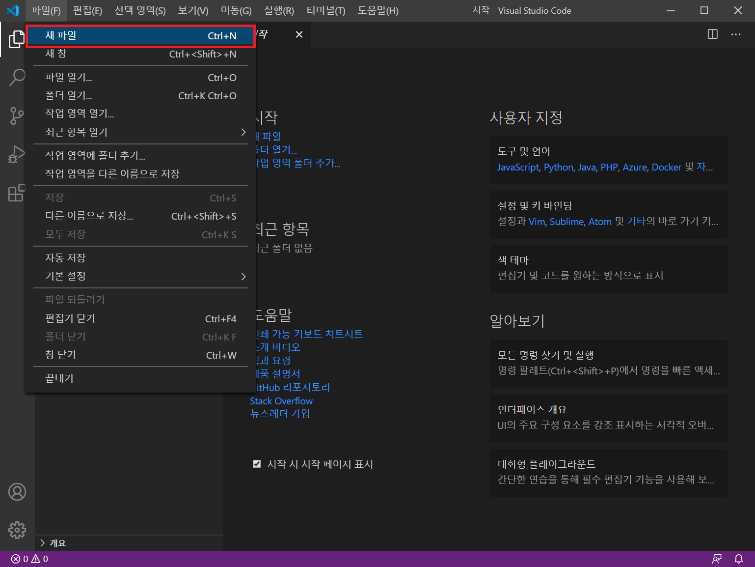 비쥬얼 스튜디오 코드 시작 화면에서 파일을 클릭하고 새 파일을 클릭합니다.