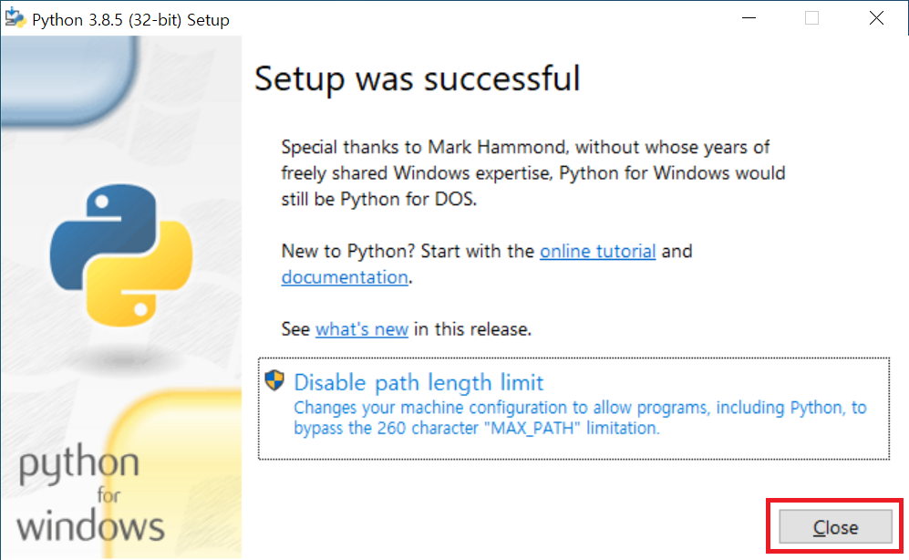 설치가 완료되었습니다. Close 버튼을 클릭합니다.