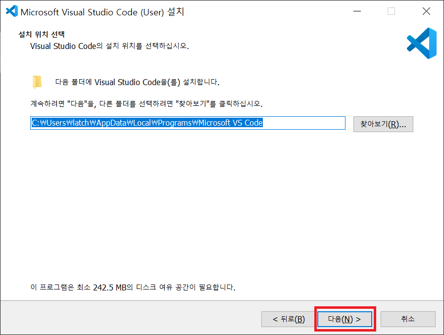 설치 경로를 확인하고 다음 버튼을 클릭합니다.