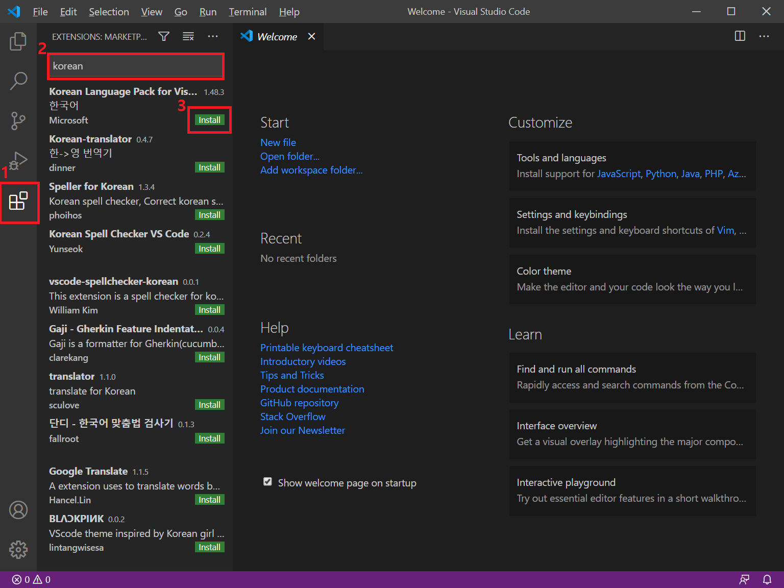 비쥬얼 스튜디오 코드의 도구 바에서 확장 버튼을 클릭하고 검색 창에 Korean을 입력한 후 Korean Language Pack for Visual Studio Code를 선택하고 Install 클릭합니다.