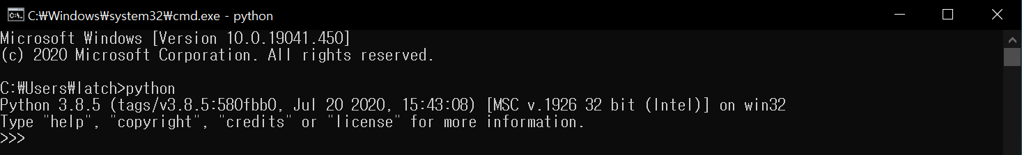 Python 3.8 (32-bit)를 실행하면 위와 같이 파이썬 인터렉티브 셀이 실행되는 것을 확인할 수 있습니다.
