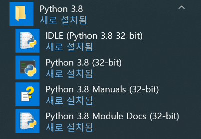 시작 메뉴에 Python 3.8이 설치된 것을 확인할 수 있습니다.