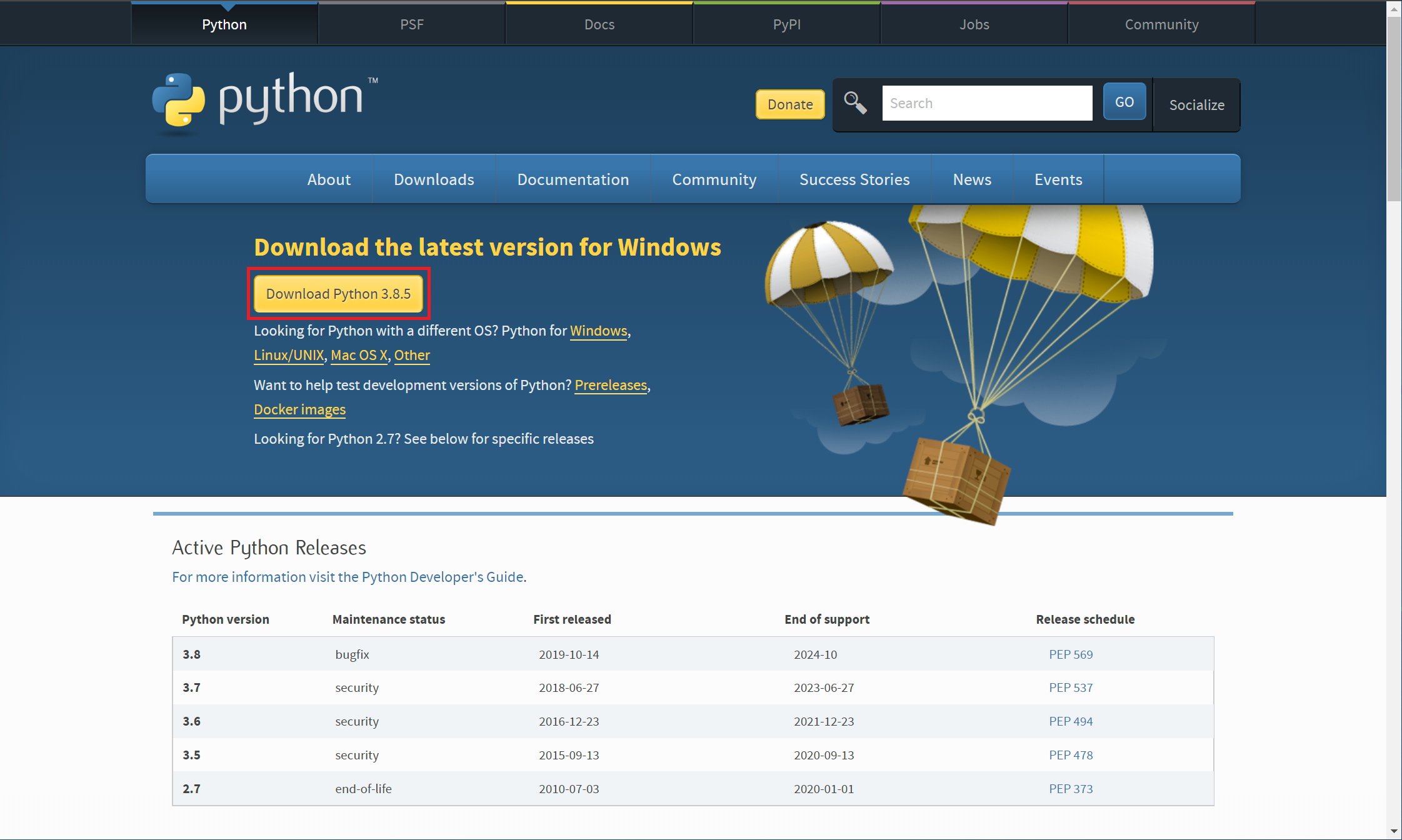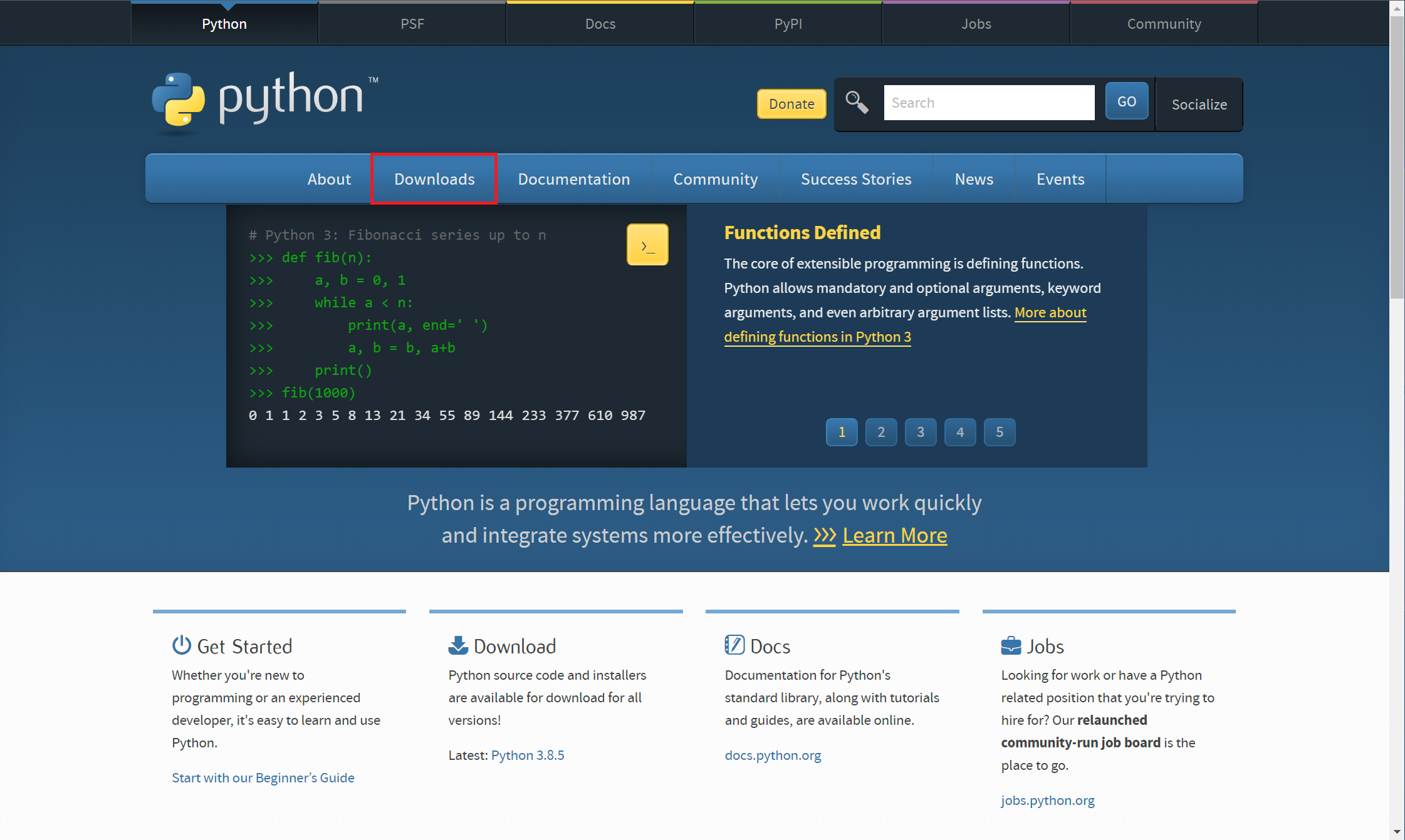 - 웹 브라우저에서 파이썬 공식 홈페이지로 이동합니다.