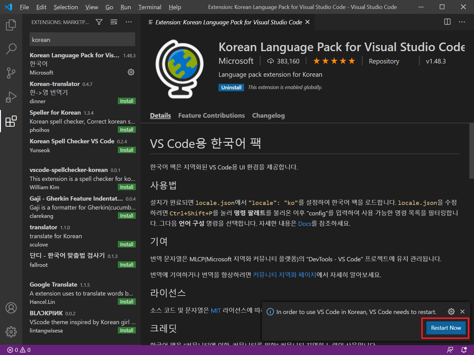 설치가 완료되면 오른쪽 하단의 창에서 Restart Now 버튼을 클릭하여 비쥬얼 스튜디오 코드를 다시 시작합니다.