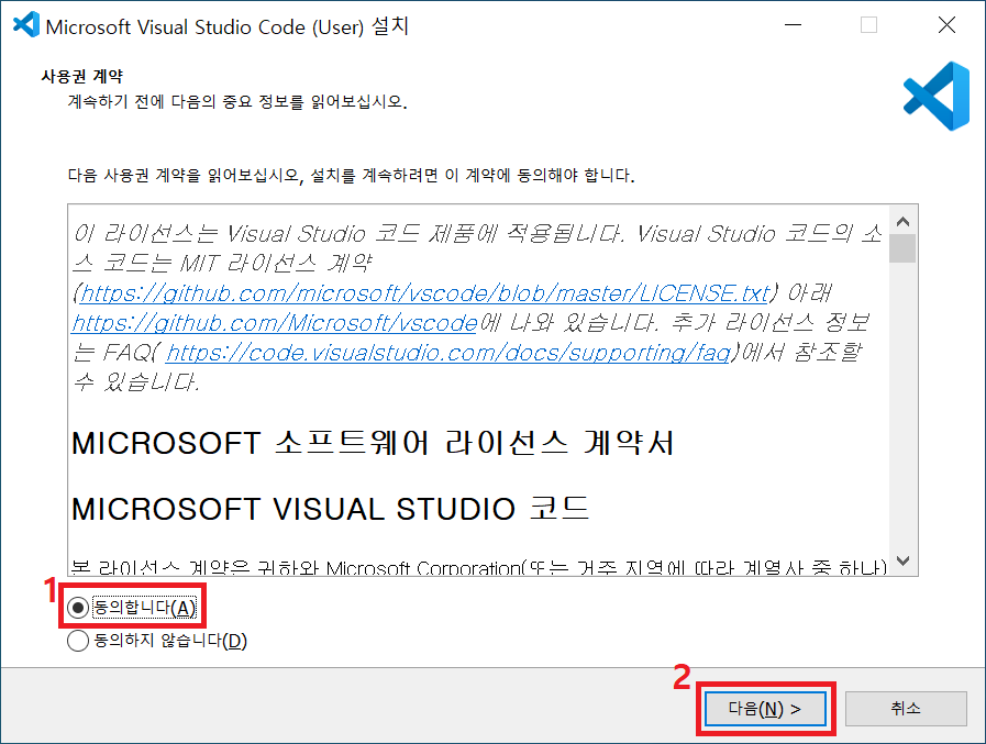 동의합니다를 체크하고 다음 버튼을 클릭합니다.