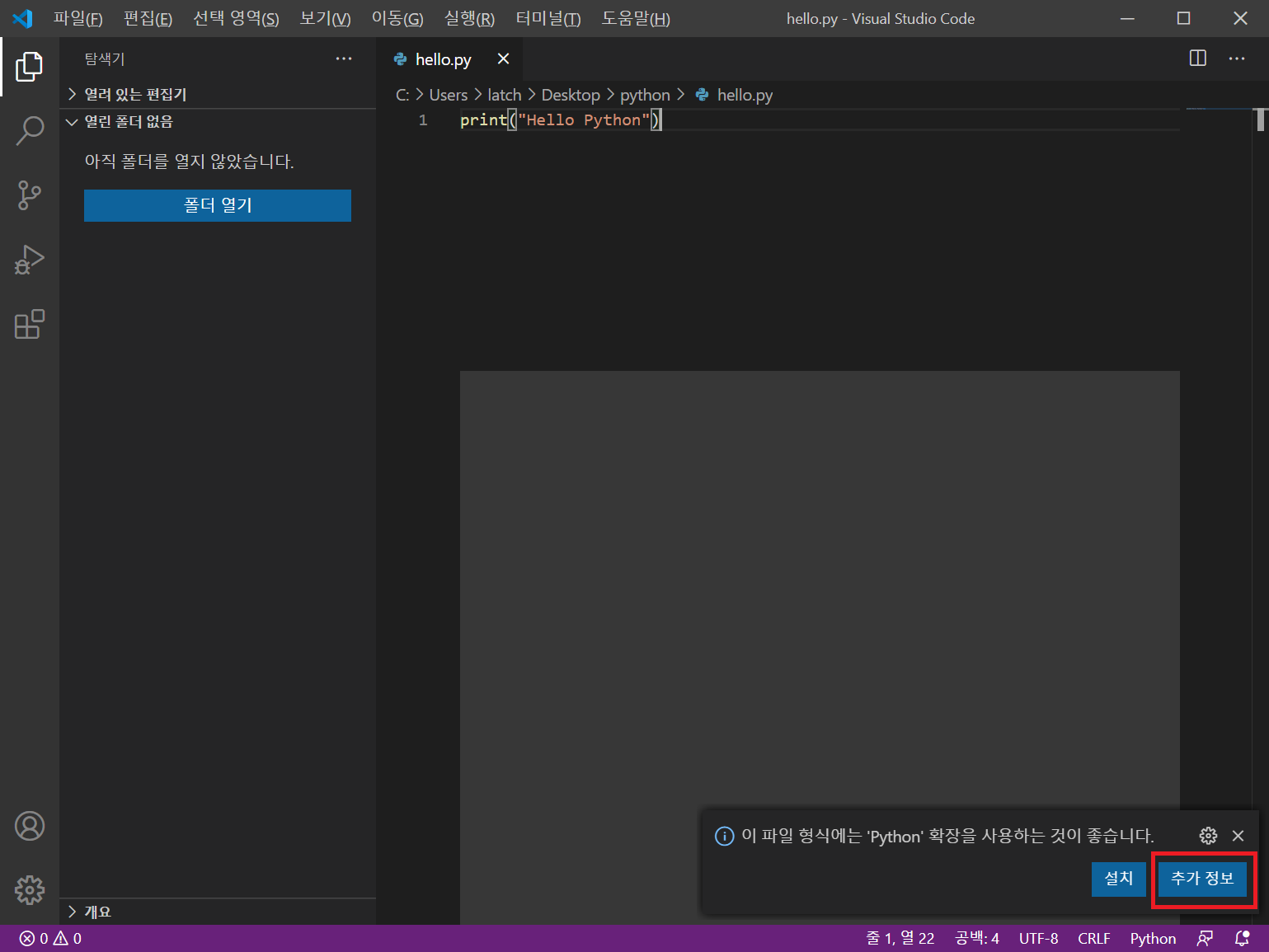 파이썬을 저장하고 나면 화면 오른쪽 하단에 이 파일 형식에는 'Python' 확장을 사용하는 것이 좋습니다. 라는 메시지가 보입니다. 이 메시지가 뜨는 이유는 파이썬을 사용한다면 추천해 줄 확장 프로그램이 있다는 것입니다. 추가 정보를 클릭합니다.