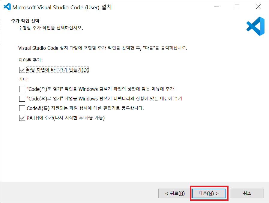 추가 작업을 선택하고 다음 버튼을 클릭합니다.