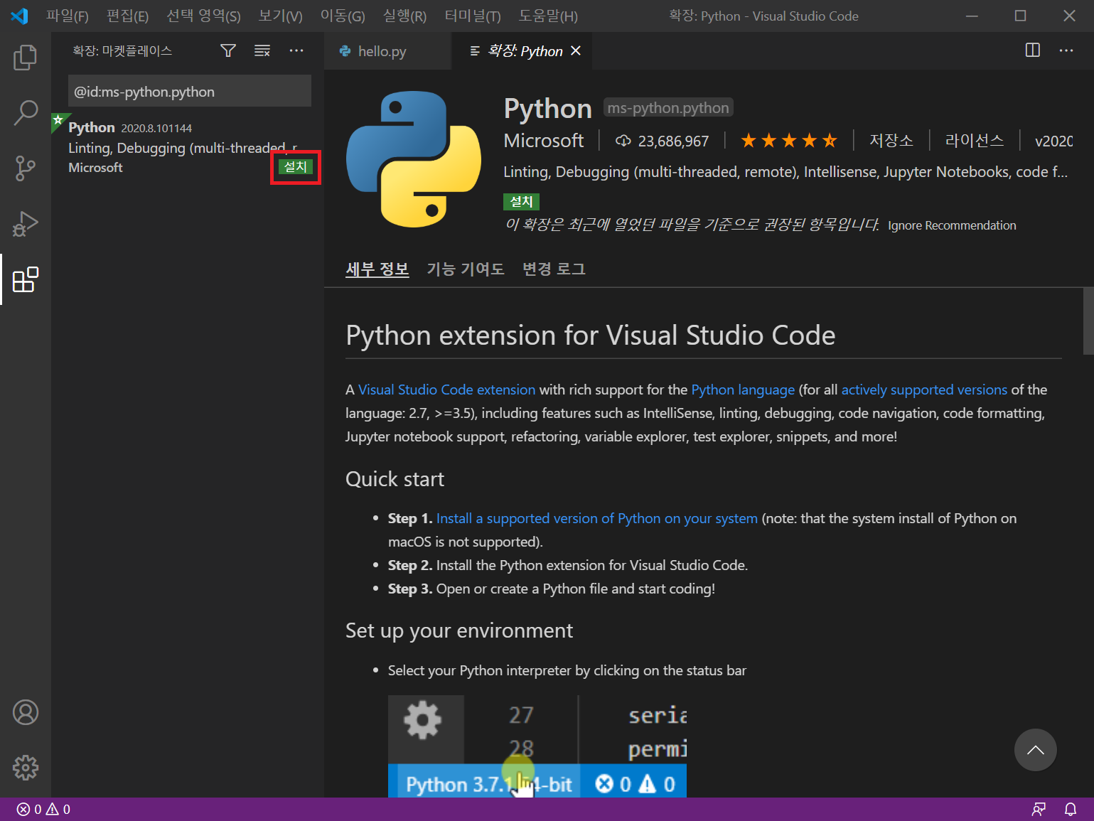 확장 메뉴에서 Python을 선택하고 설치를 클릭합니다. 설치 후 다시 로드를 클릭하면 비쥬얼 스튜디오 코드 화면이 실행됩니다.